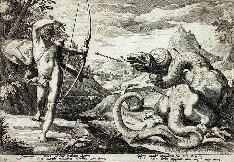 Febo (Apollo per i greci, dio dell’arte e della musica, nonché della luce) uccide Pitone.
