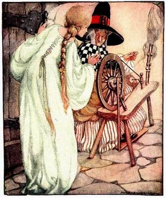 “Oh, nonnina,” disse la principessa, “che cosa stai facendo?” – “Filo,” rispose la vecchia, e assentì con il capo. “Come gira quest’aggeggio!” esclamò la fanciulla, e prese in mano il filo per filare anche lei. Ma non appena lo toccò, si compì l’incantesimo ed ella si punse un dito.